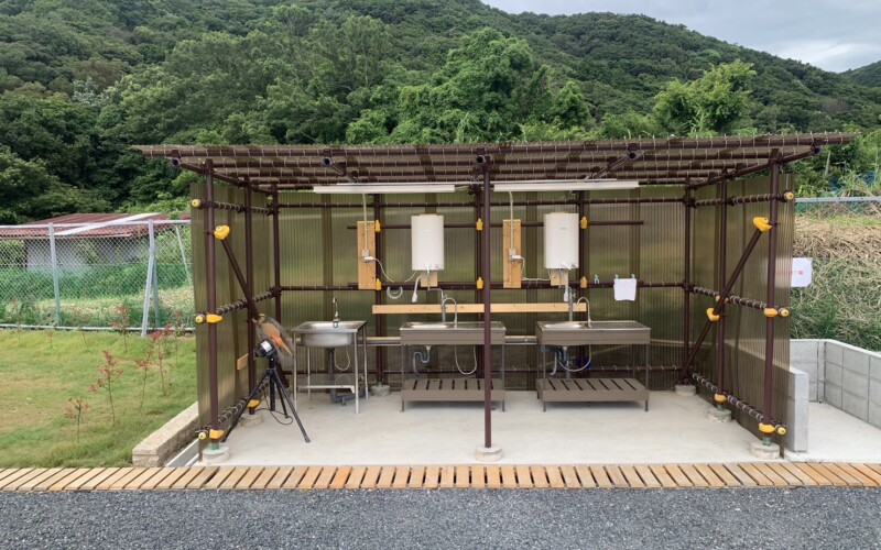 共用スペースは、エアコン完備の水洗トイレ、炊事場、サイト別の電源も設置しており、